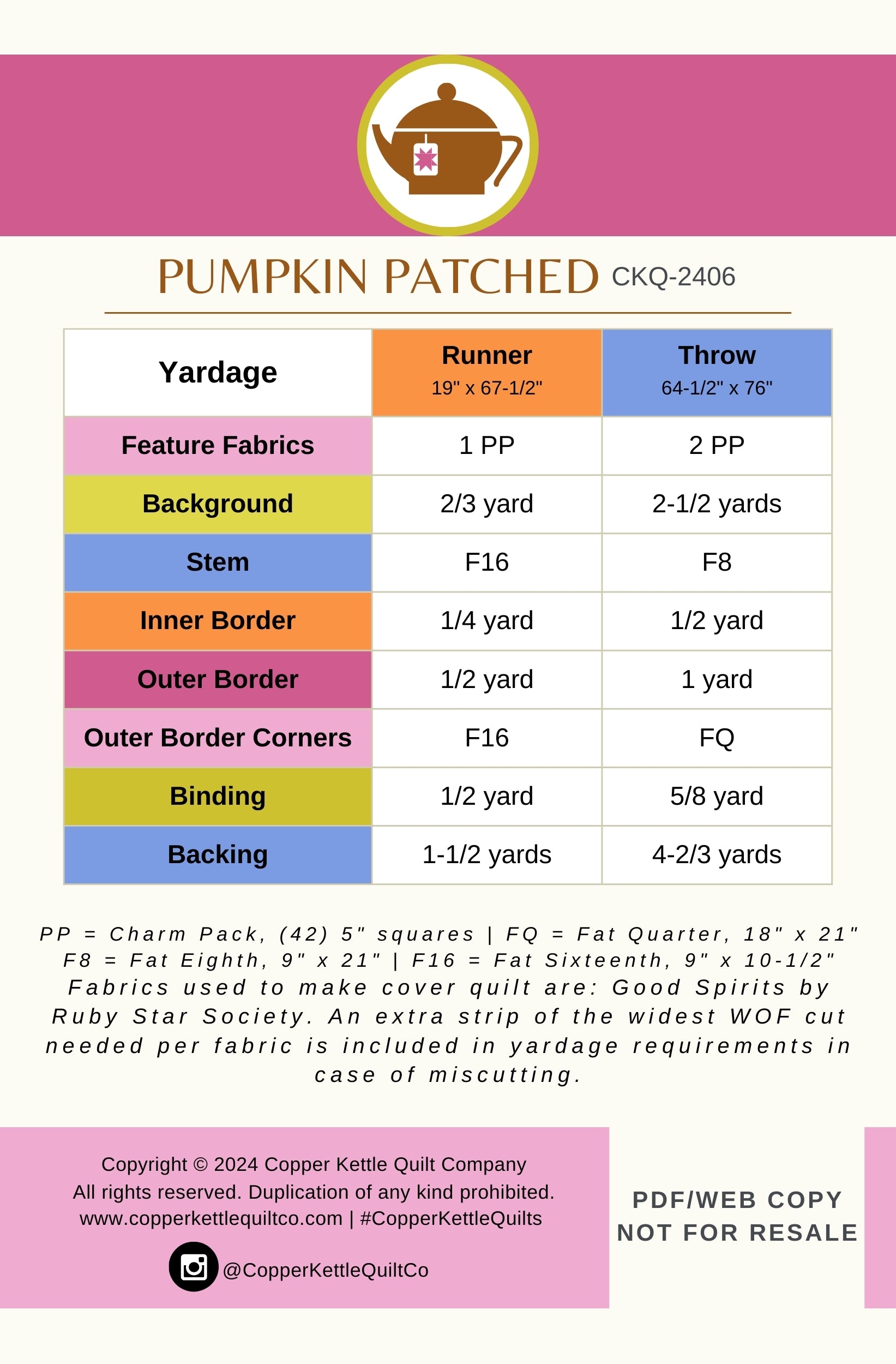Whether you're an experienced quilter or just starting out, this pattern offers clear instructions and detailed illustrations to guide you through the process. Instructions and yardage for a runner and a throw size quilt included. Bonus material in the For Sewists section of the website. Product is a digital PDF version of the quilt pattern that will be delivered upon completion of website checkout. For paper pattern copies, please reach out to your Local Quilt Shop and request they carry Copper Kettle Quilt Co. patterns!