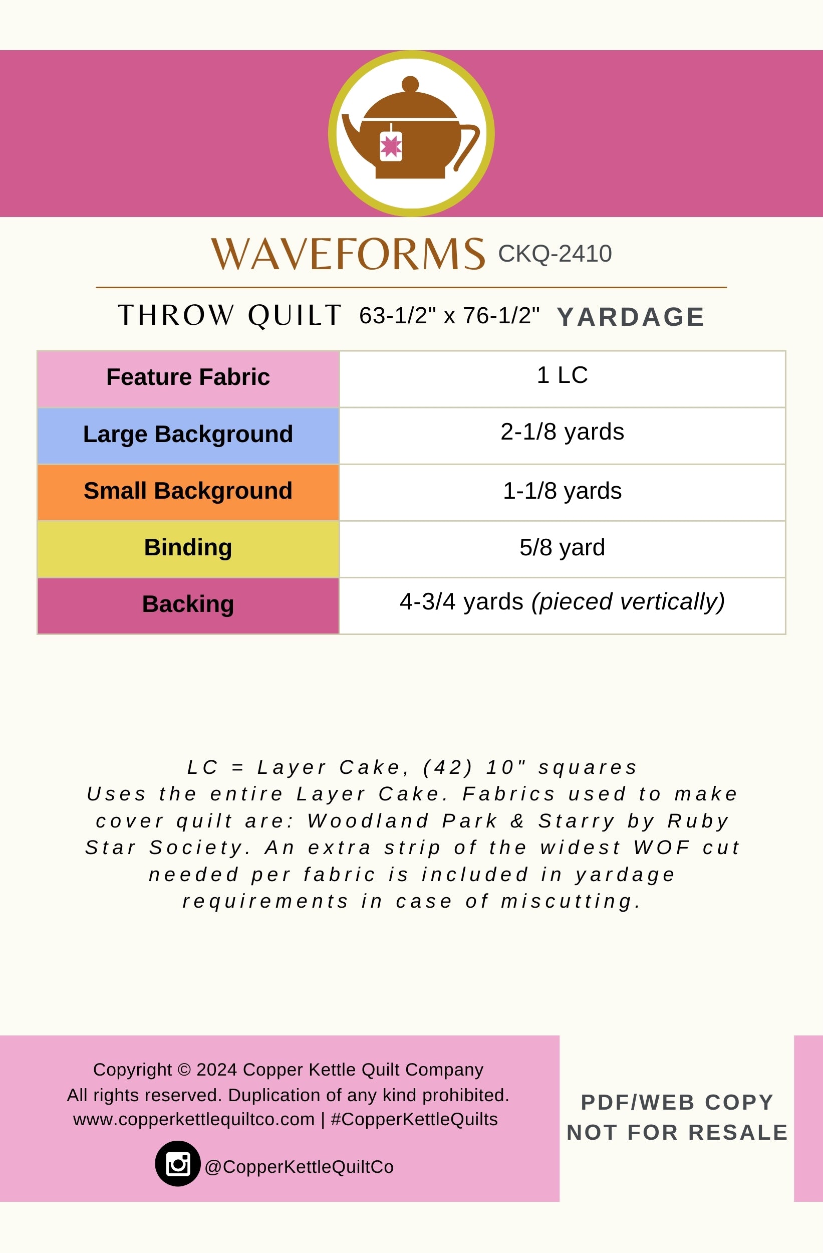 Instructions and yardage for a throw size quilt included. Bonus material is available in the For Sewists section of the website. Product is a digital PDF version of the quilt pattern that will be delivered upon completion of website checkout. For paper pattern copies, please reach out to your Local Quilt Shop and request they carry Copper Kettle Quilt Co. patterns!
